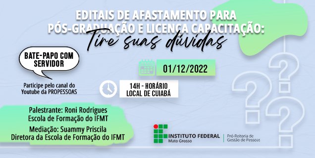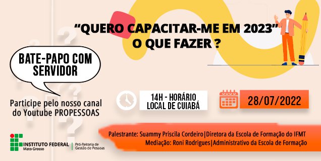 O IFMT através da Pró-reitoria de Gestão de Pessoas (Propessoas), convida os servidores e servidoras para participarem no dia 28 de julho, às 14 horas (horário de Cuiabá), do Bate-papo com o servidor sobre capacitação para o ano de 2023.
