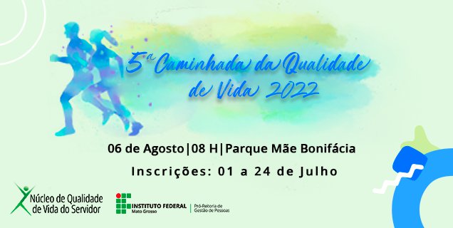 O Instituto Federal de Mato Grosso (IFMT) por meio de seu núcleo de Qualidade de Vida, convida a comunidade para mais uma edição da Caminhada da Qualidade de Vida do IFMT, que será no dia 06 de agosto, às 8h, no Parque Mãe Bonifácia.