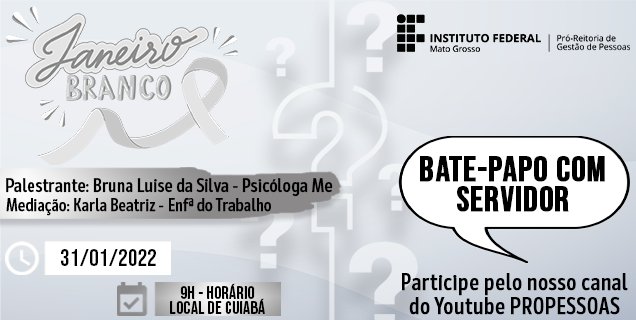 A Pró-Reitoria de Gestão de Pessoas do IFMT (Propessoas) lança o primeiro Bate-papo com Servidor 2022 que, neste início de ano, destaca a saúde mental e a campanha do Janeiro Branco. O webinar contará com a participação da Psicóloga Me. Bruna Luise da Silva e a mediação da Enfermeira do Trabalho Karla Beatriz. A transmissão será no dia 31 de janeiro, às 09h (horário de Cuiabá), no canal da Propessoas no Youtube. Participe!